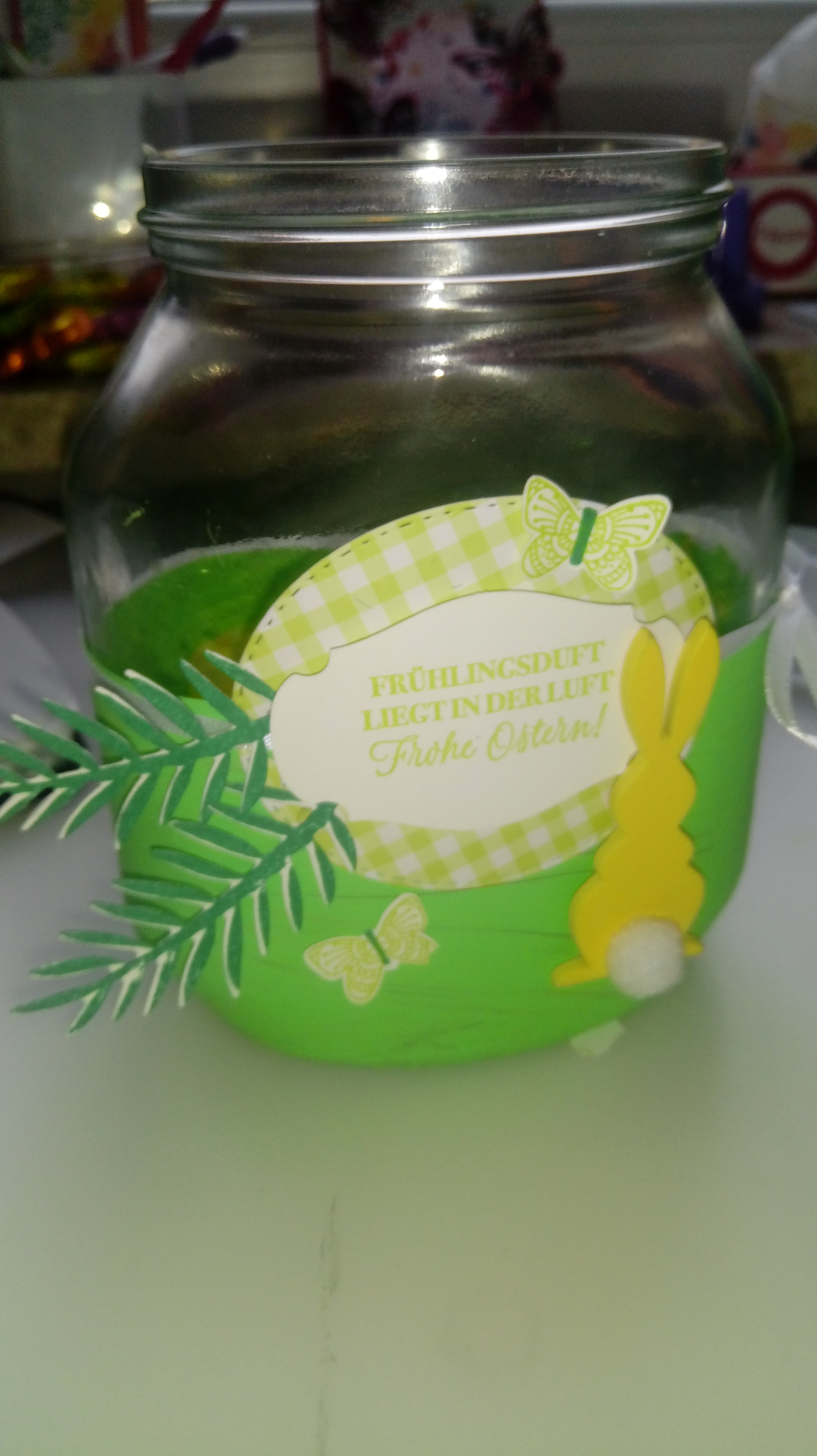 Natürlich kann man diese DIY Deko mit allen möglichen Gläsern machen. Ich hab zum Beispiel noch ein Spargelglas aufgehübscht, das kann man prima als Vase für Tulben oder Osterglocken nutzen.