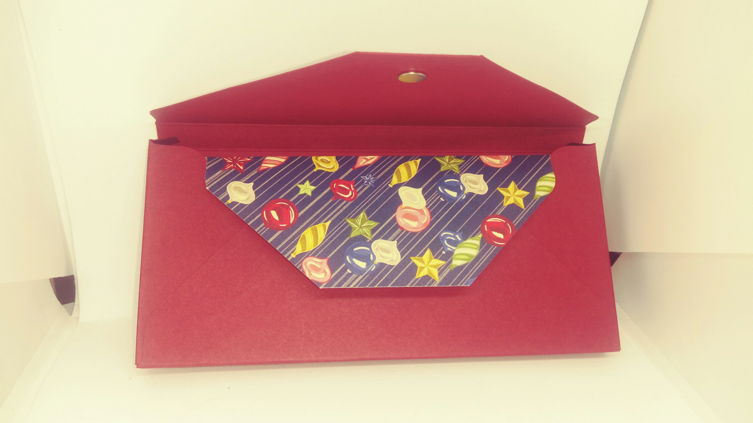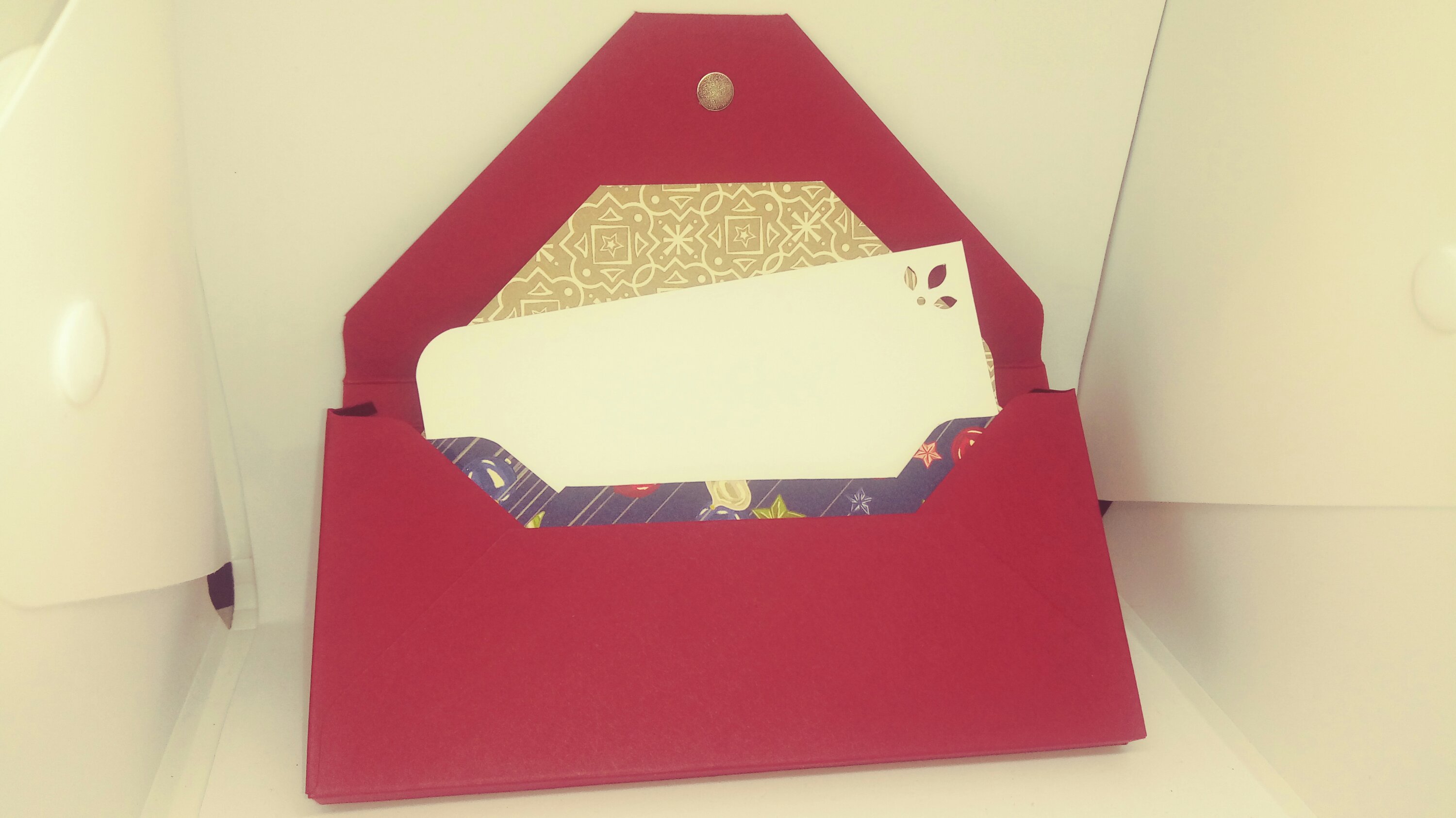 Im inneren dieses 3D-Briefumschlag ist ein weiterer Briefumschlag. Darin befindet sich eine Karte, die man für Weihnachtsgrüße nutzen kann und um einen Gutschein darin zu bewahren.